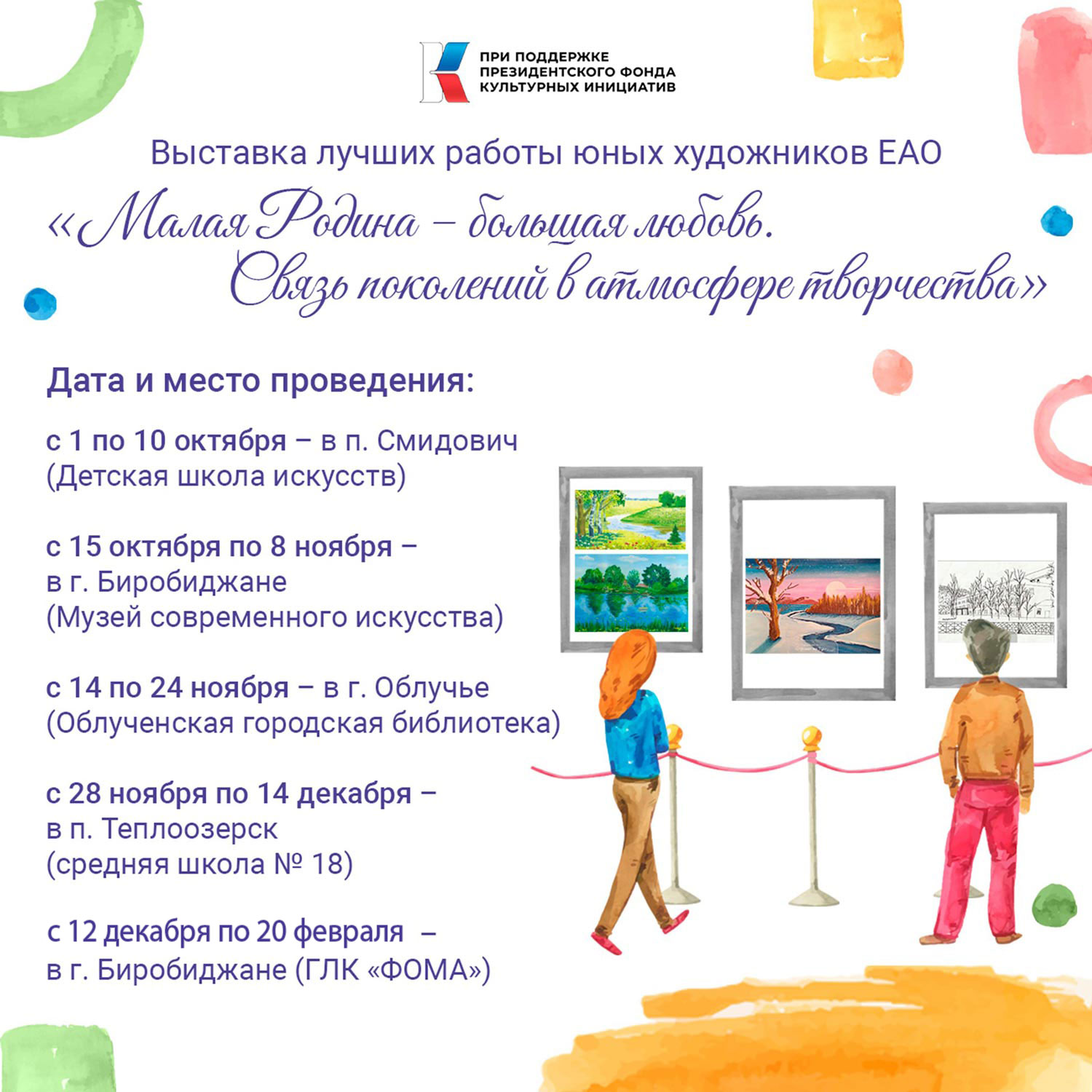Выставки лучших работ юных художников ЕАО пройдут в разных районах области с октября этого года по февраль 2026-го. Подробности — в нашей афише.